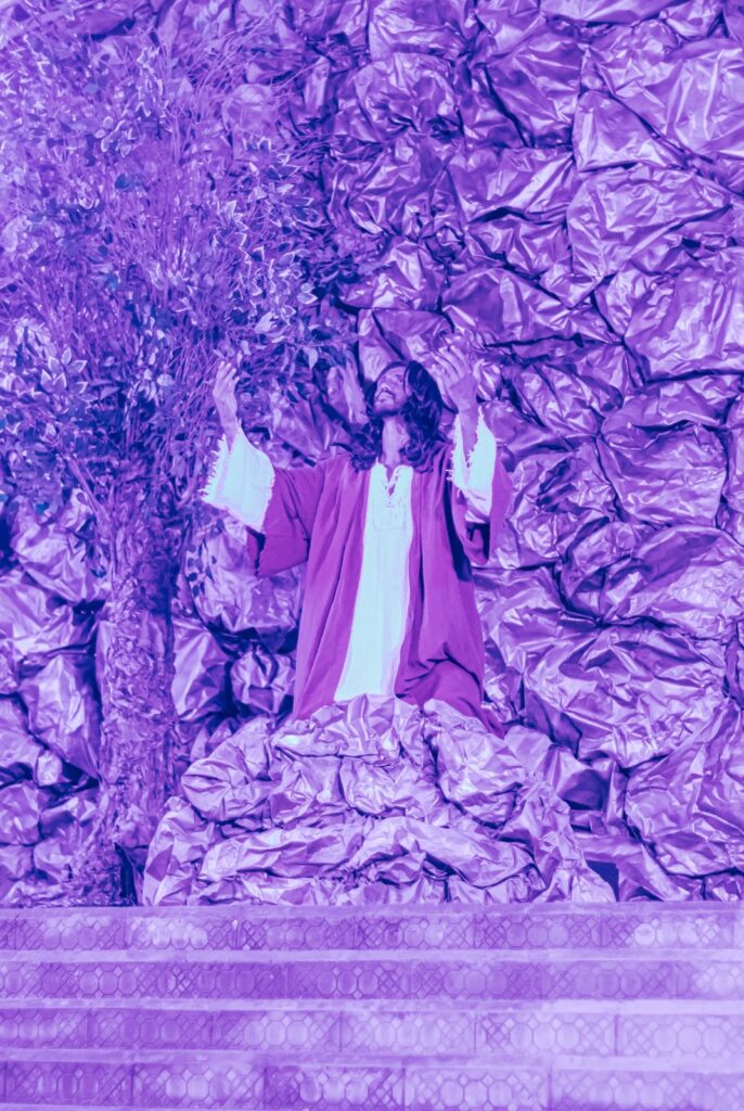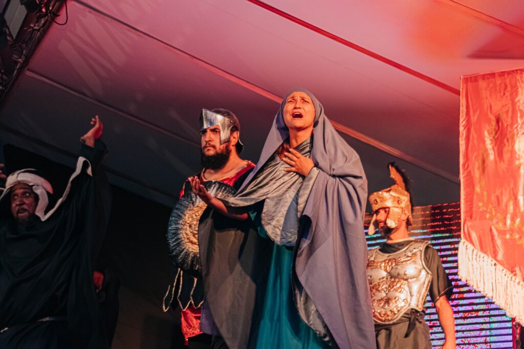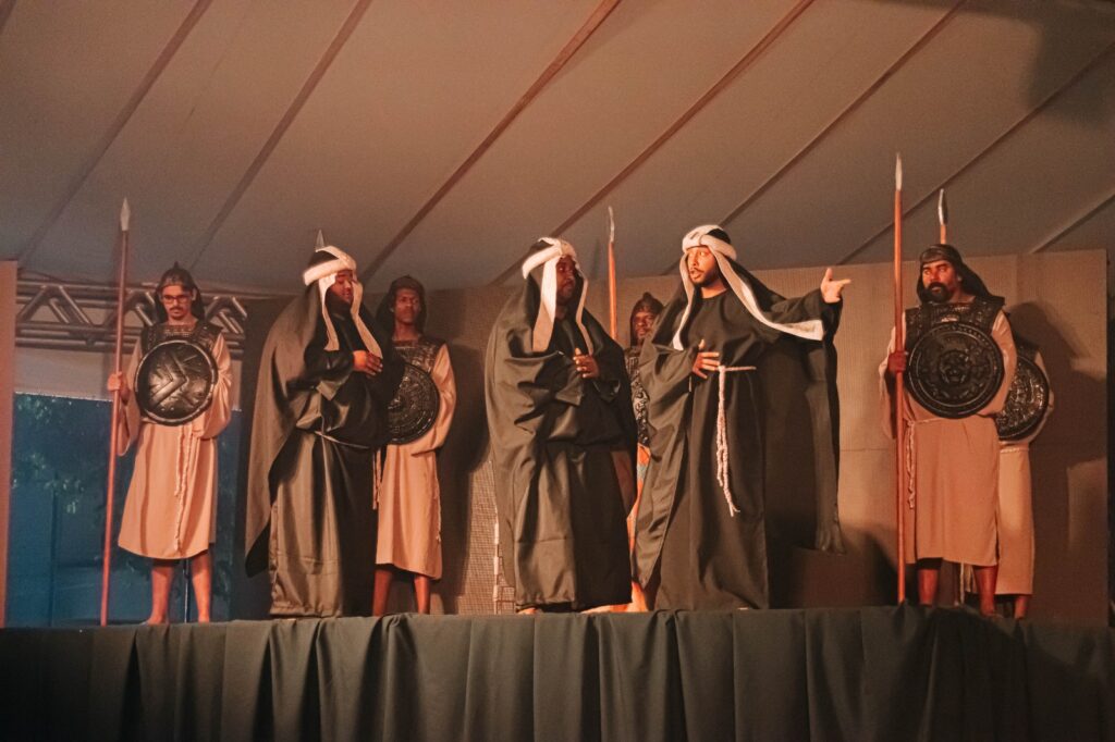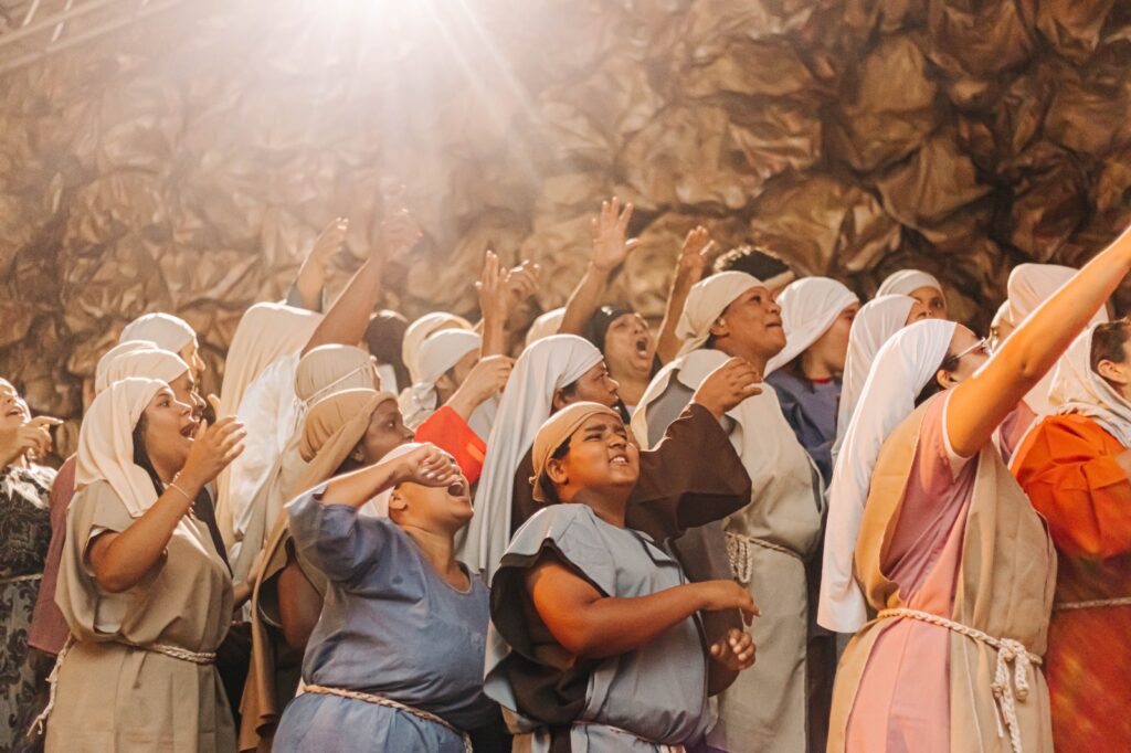 O espetáculo aconteceu na Praça Santa Luzia, que, nesta edição, contou com um espaço especialmente preparado e coberto com tendas, garantindo mais conforto ao público presente. A estrutura ampliada, aliada a recursos tecnológicos modernos e a um elenco preparado, proporcionou uma experiência ainda mais envolvente e marcante.